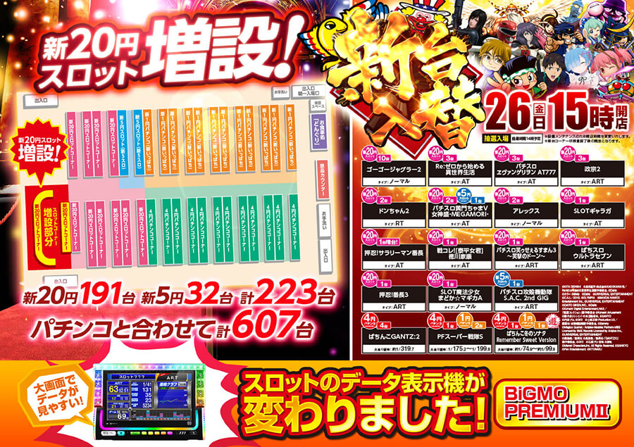 台データ情報・設置機種情報を掲載中!メッセージに「新台」と打ち込むと次週導入予定の情報をご案内いたします